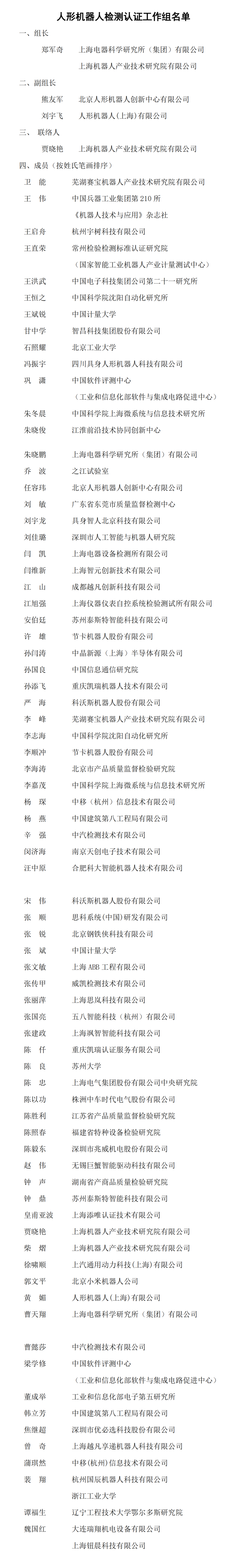 工作组目前有77位专家,来自64个单位,国家机器人检测与评定中心(总部)主任、星空官网(中国)机器人有限公司官网院长郑军奇任工作组组长,北京人形机器人创新中心有限公司总经理熊友军和国家地方共建人形机器人创新中心技术总监刘宇飞任副组长。