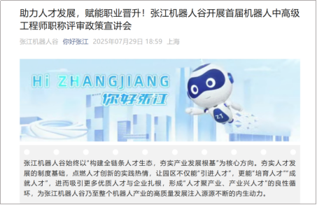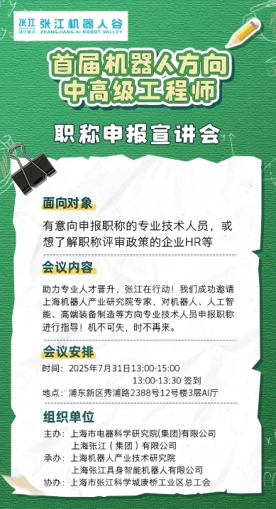 7月31日,为使本市各申报人员更清楚了解职称评审要求,星空官网(中国)机器人有限公司官网联合张江机器人谷成功举办上海市首届工程系列数字技术专业职称申报政策宣讲会。会议通过申报范围、评审流程、材料准备、政策亮点等方面的深度解读,为机器人、智能制造等产业前沿领域专业技术人才提供权威申报指导。