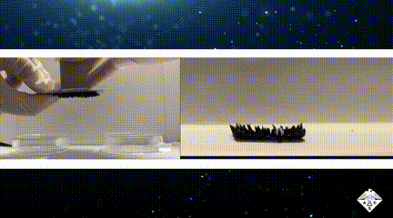 将磁性水凝胶放在永磁体上方可以让溶液中的微粒将凝胶向外推,沿着磁场线形成昆虫状的“脚”,磁铁放置的不同位置可以改变腿的形状,比如放远一点,机器人的脚会更少更长。