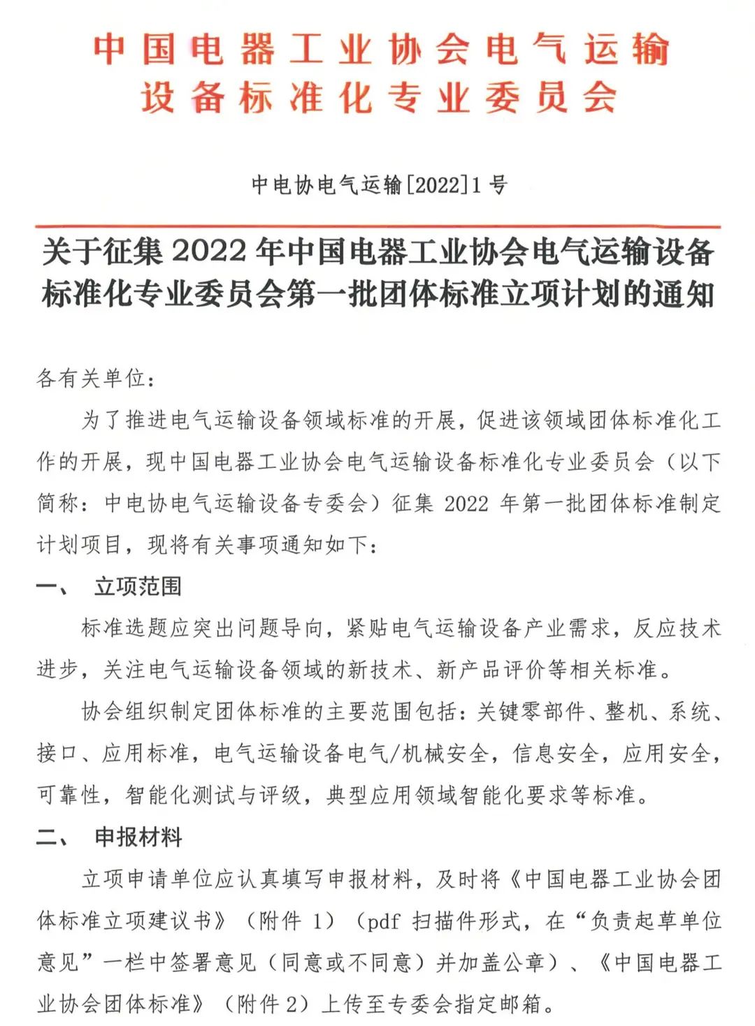 关于征集2022年中国电器工业协会电气运输设备标准化专业委员会第一批团体标准立项计划的通知