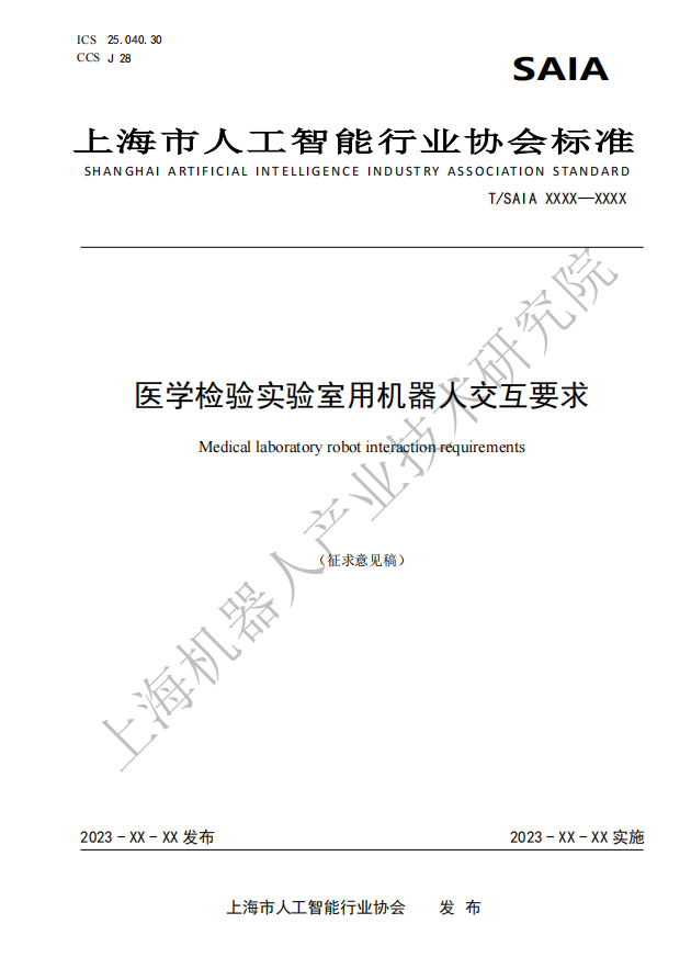 由上海市人工智能行业协会归口,星空官网(中国)机器人有限公司官网有限公司作为主要起草单位研制的四份标准:《医学检验实验室用机器人通用技术条件》、《医学检验实验室用机器人系统安全要求》、《医学检验实验室用机器人交互要求》、《医学检验实验室用机器人使用环境要求》现公开征求意见。