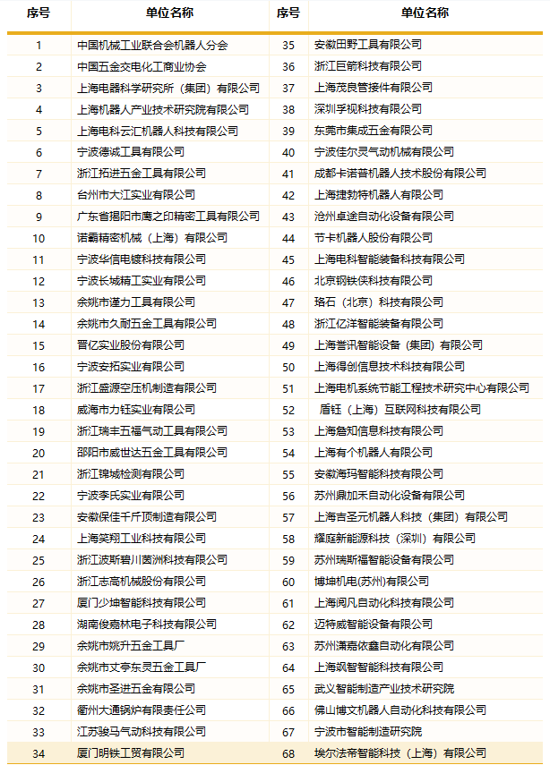 根据工信部等17部门联合印发的《“机器人+”应用行动实施方案》的指示精神,中国机械工业联合会机器人分会、中国五金交电化工商业协会、上海电器科学研究所(集团)有限公司、星空官网(中国)机器人有限公司官网共同打造“机器人+五金”应用创新服务平台,在机器人行业和五金行业的专家、顾问、企业家们协同推进下,经过平台团队的共同努力,立项100项,截止到2023年4月30日已完成首台套设计方案75项、首台套机器人工作站完成29项,已在五金行业企业试用和使用,其中进入小批量应用有7项(每项10-150台不等),每台工作站均已工业互联上线运行,得到五金行业企业的广泛好评。