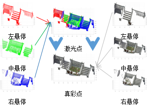 由无人机搭载的激光扫描仪从不同的悬停角度对目标物进行扫描后合成三维激光点云模型进而由双目拍摄系统所拍摄的真彩图像进行联合标定真彩覆盖,达成数据融合,以形成最终的真彩点云模型。